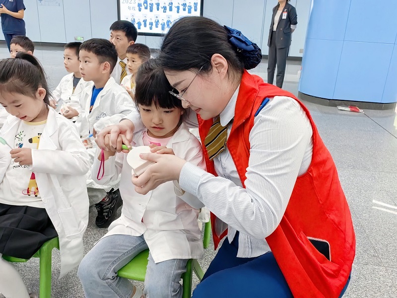 換上白大褂,變身“小牙醫(yī)”。5月8日下午,鄭州地鐵12號線聯(lián)合愛康體檢中心與金水區(qū)常春藤幼兒園在黃河南路站開展“萌娃變身牙醫(yī) 守護(hù)健康微笑”活動。一群小萌娃進(jìn)入地鐵站開啟了關(guān)于口腔健康的“探索之旅”!